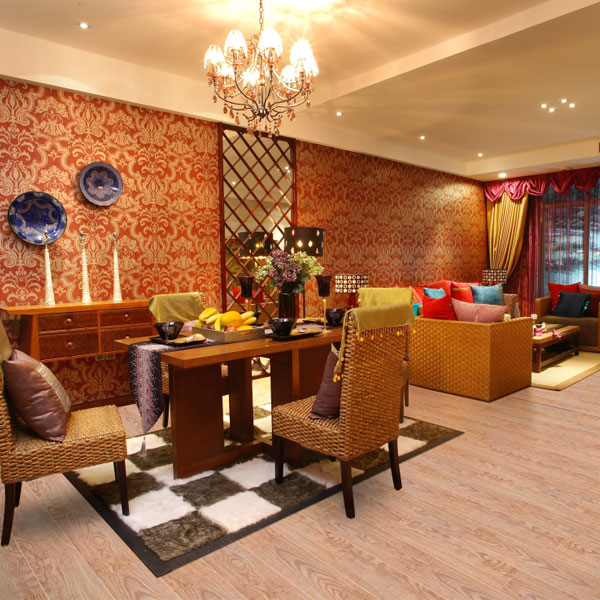 東南亞國家地處熱帶、亞熱帶之間,氣候炎熱,因此,木石結構,砂巖裝飾, 墻紙的運用,浮雕,木梁,漏窗都是東南亞傳統風裝修中不可缺少的元素,還有清涼的藤椅,造型逼真的佛手,嫵媚的紗幔等等,而當這一切都和諧地兼容于一室時 , 東南亞的清雅、飄逸的氣氛便撲面而來。適宜地板: 顏色、材質:東南亞風格講求色彩艷麗,不能選擇帶有做舊工藝的地板,半亞光漆面的地板比較適宜。可以選擇拼花或者雙拼色地板進行搭配,但需要注意的是,所選地板顏色不能夠過于雜亂,否則會使居室空間顯得累贅。 很多人在選擇地板時,都是根據居室的色調來選擇地板的材質和顏色,但事實上,除了色調,還更應該考慮家庭的裝修風格。